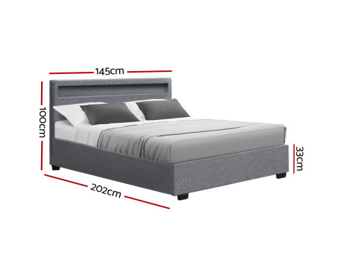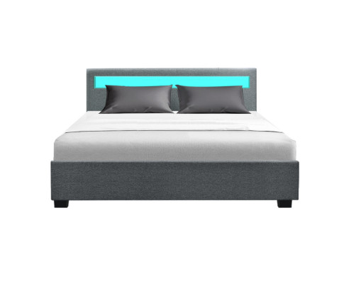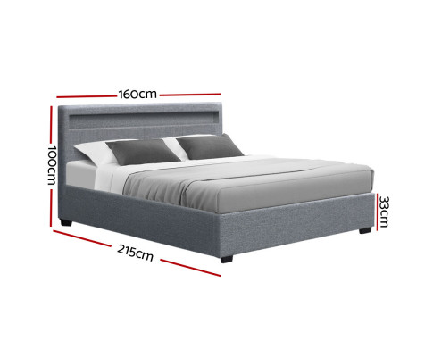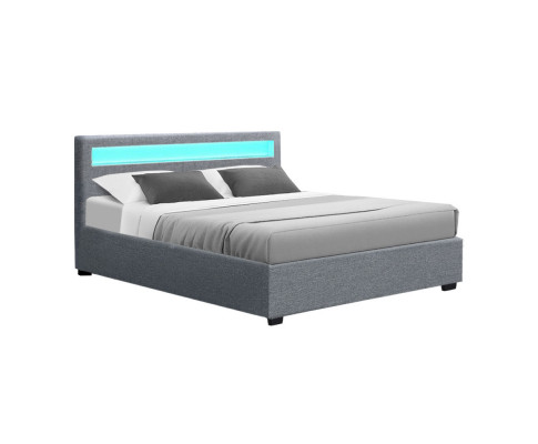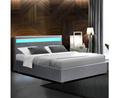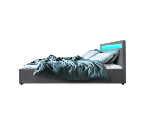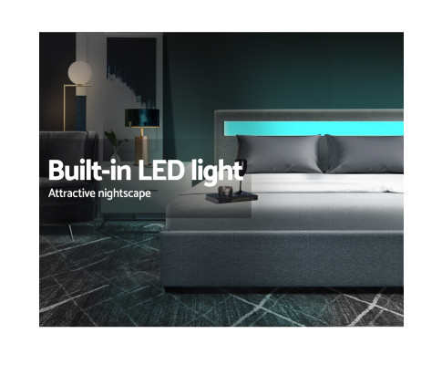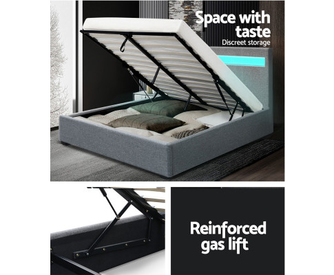 When is a bed more than a bed? When it uses our Cole Gas Lift Bed Frame. On the outside, this bed frame looks like just any other quality bed frame. Beautifully padded with generous foam and covered in faux linen fabric. Strong steel frame with high grade steel centre rails, heavy-duty bars and arched slat base. Large and comfortable headboard. But with one easy gas lift of the bed base, the bed frame becomes an instant storage area with acres of space for your bedding essentials. Simply store your extra pillows, bed sheets, cushions and more in the storage compartment and hide them away for the season. Even better, you no longer have to fumble in the dark for a light switch in the middle of the night with this bed frame. It comes with built-in LED lighting that can be customised into 16 different colours and 4 flashing modes to suit your preference. Not only will the illuminated bed frame create a beautiful ambience, it will also save you from buying extra bedside lamps or nightlights. So do not just get any bed frame, get this 3-in-1 bed frame to expand your home storage capacity and light up your nights with just a lift of your hands.