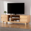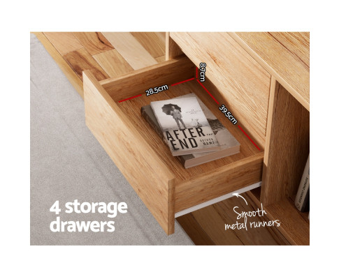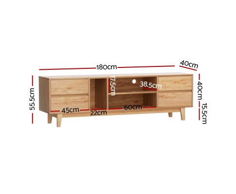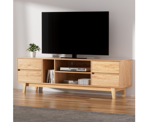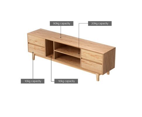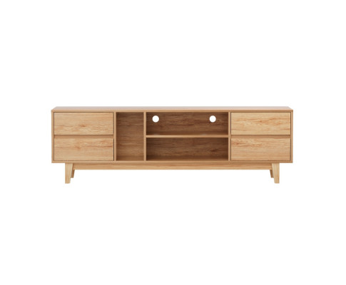 Style and functionality blend together in the beautiful Asa Entertainment Unit from Artiss. This lowline entertainment unit has the perfect height and storage capacity for all your entertainment needs, from your television to your sound system and consoles. The simple handle-less design and natural wood-grain finish will blend in perfectly with modern homes. Made from thick particleboard with a smooth melamine finish and solid rubberwood, the unit is sturdy and durable for long-lasting use. Four generous storage drawers and three open shelves with cable management are perfect for your media, books, equipment and other trinkets. The solid rubberwood legs feature anti-slip feet to ensure the unit stays standing and prevents scratches to your floors. Easy to assemble and even easier to maintain, the Asa Entertainment Unit will keep your home theatre organised for years to come.