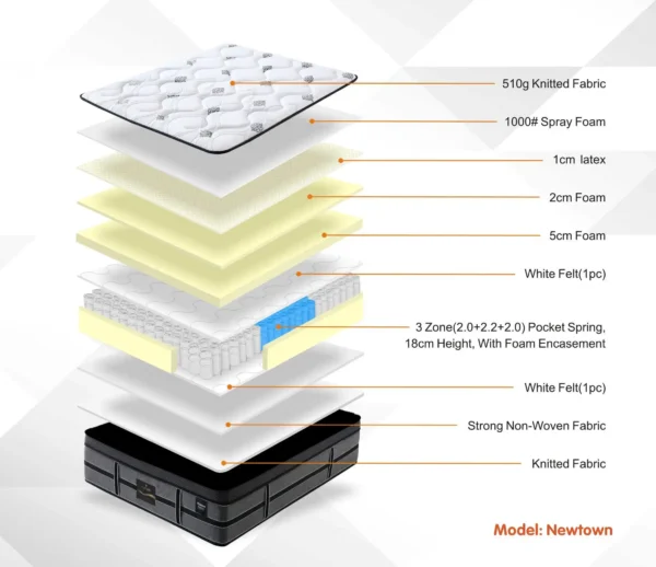 One of the standout features of our Newtown range of mattresses is the medium/firm sleeping feel. This ensures that you get the right level of support for your body, while still enjoying a comfortable night’s sleep. The 510g thick knitted fabric cover provides a luxurious feel, while the 1000# spray foam, 1cm of latex, a 2cm foam layer, and another 5cm foam layer work together to provide the perfect level of comfort and support.